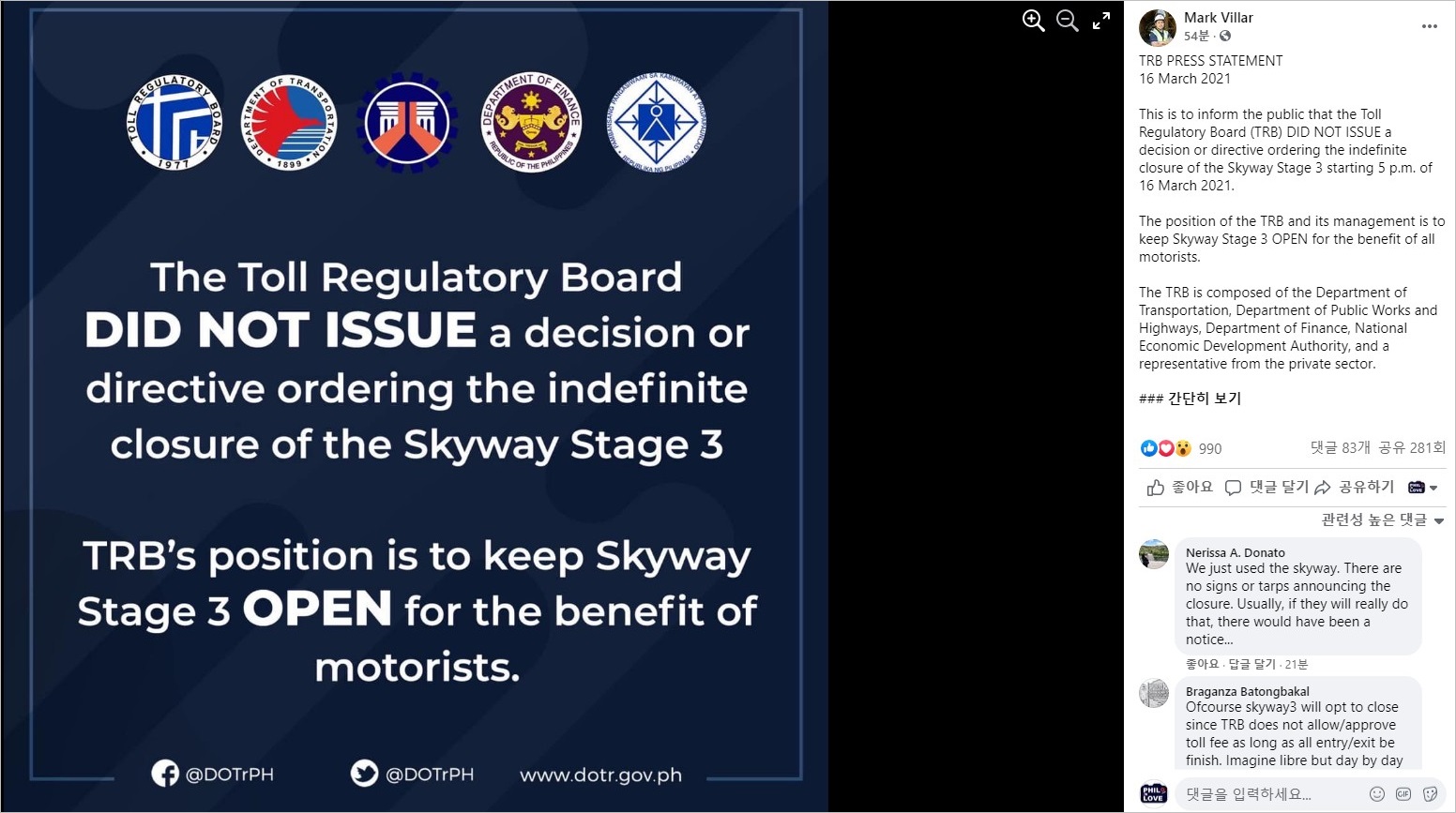 스카이웨이 고속도로를 운영하는 SOMCO에서는 어제 공식 트위터를 통해 램프 공사를 마칠 때까지 마닐라 스카이웨이 스테이지3 구간(Skyway Stage 3)의 운영을 중단한다고 발표했다. 언제 공사가 끝나서 다시 도로를 이용할 수 있는지조차 언급이 되지 않은 공지문을 통해 SOMCO에서는 이번 스카이웨이 폐쇄는 통행료심의위원회(TRB)의 결정에 따른 것으로 3월 16일 화요일 오후 5시부터 적용된다고 알렸다. 그리고 오늘 아침, 마크 빌라(Mark Villar) 공공사업도로부(DPWH) 장관은 페이스북을 통해 통행료심의위원회(TRB-Toll Regulatory Board)에서는 스카이웨이의 무기한 임시 폐쇄를 명령하지 않았음을 알렸다. 공공사업도로부(DPWH), 재무부(DOF), 필리핀 경제개발청(NEDA) 등으로 구성된 TRB의 입장은 운전자를 위해 스카이웨이를 개방 상태로 유지하기를 바란다는 것이다.