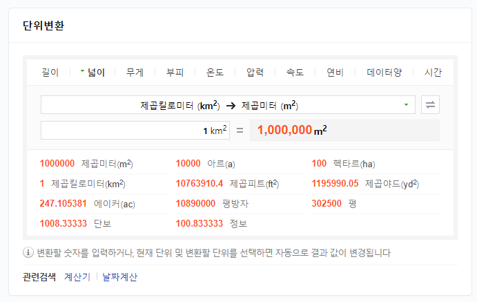 (주의) 길이의 단위에서는 미터(m)의 1000배가 킬로미터(km)이지만, 넓이의 단위에는 1000의 제곱인 백만 배가 됨.