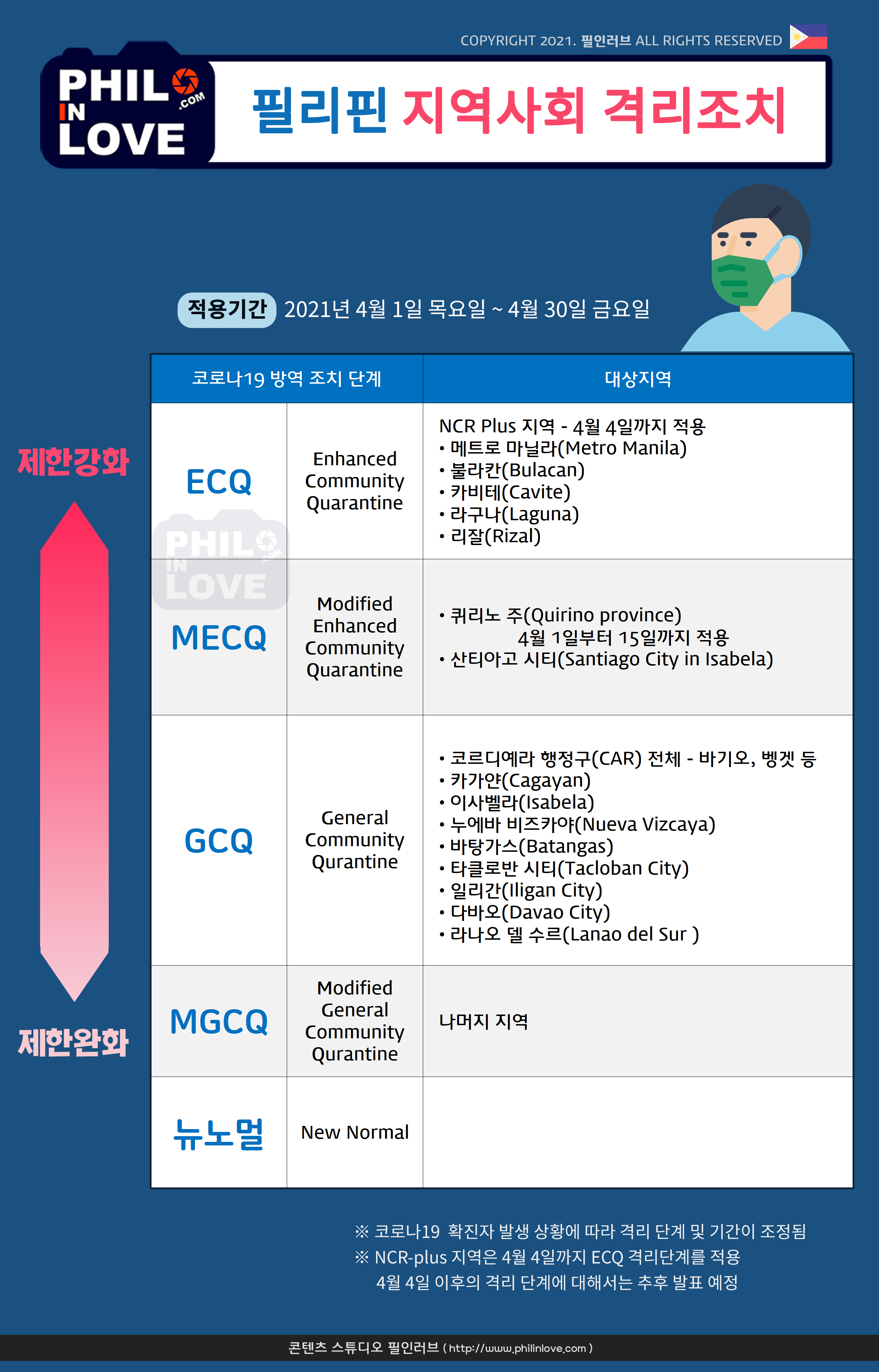 | ECQ Season 2 - 메트로 마닐라, 불라칸, 카비테, 라구나, 리잘 지역 ECQ 격리단계 적용 (0) | 2021.03.27 |