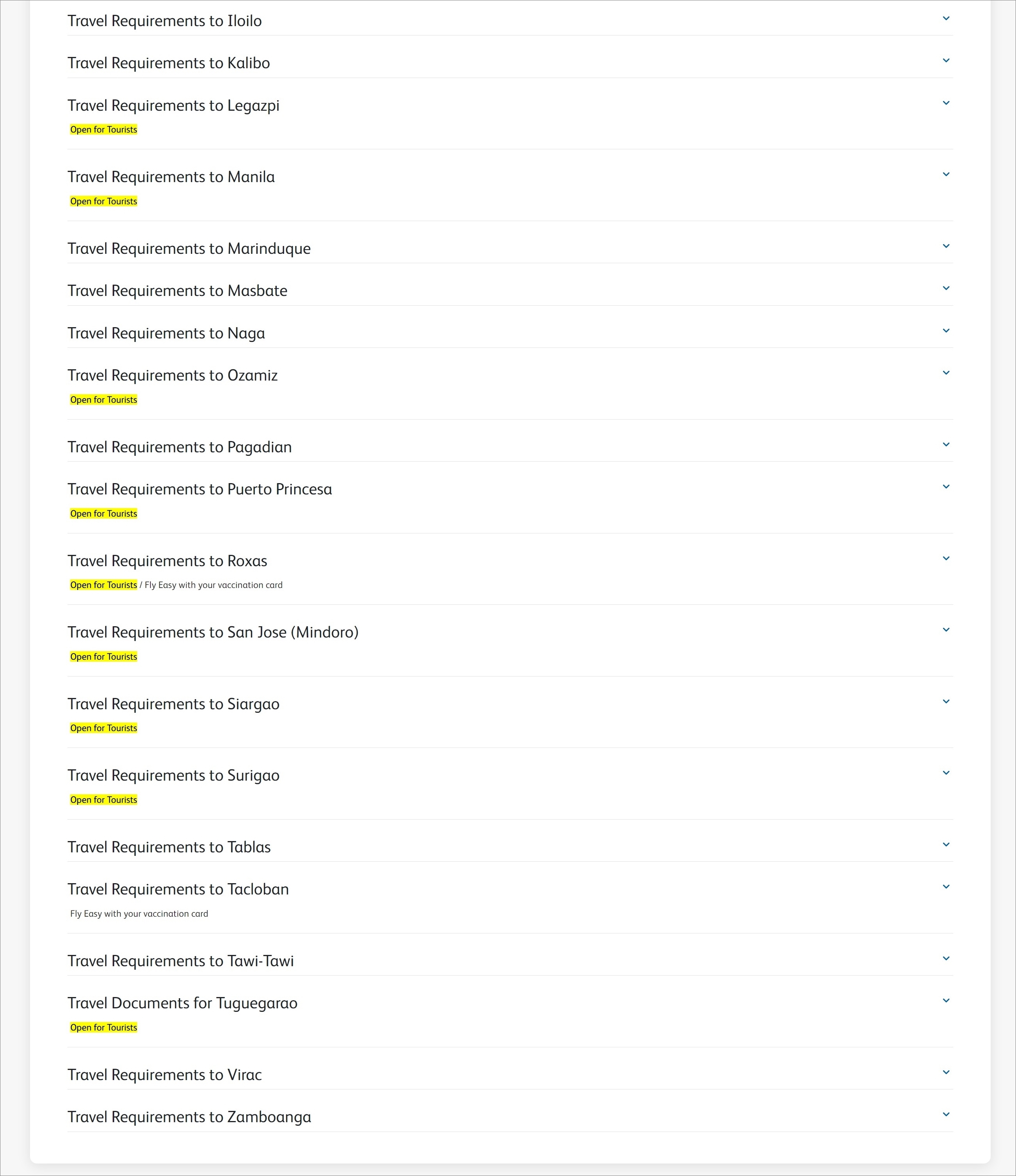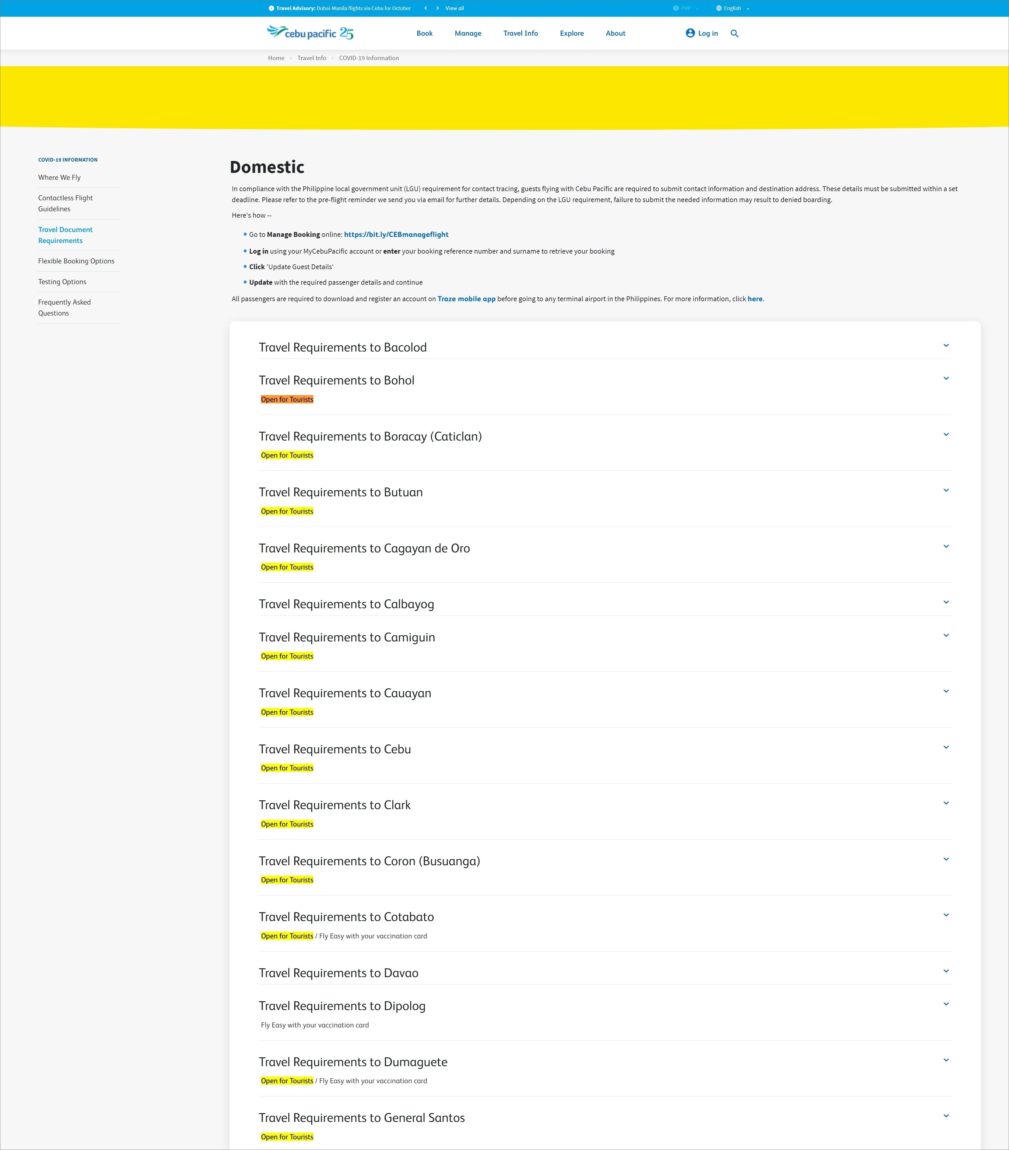 지방정부(LGU)의 여행 관련 규정은 필리핀항공 쪽이 훨씬 더 잘 정리해두었지만, 세부퍼시픽 항공사의 웹사이트를 보는 것은 목적지별로 Open for Tourists 라고 별도 표기해 두어서, 현재 어느 지역이 여행 가능한지 쉽게 파악할 수 있기 때문이다.