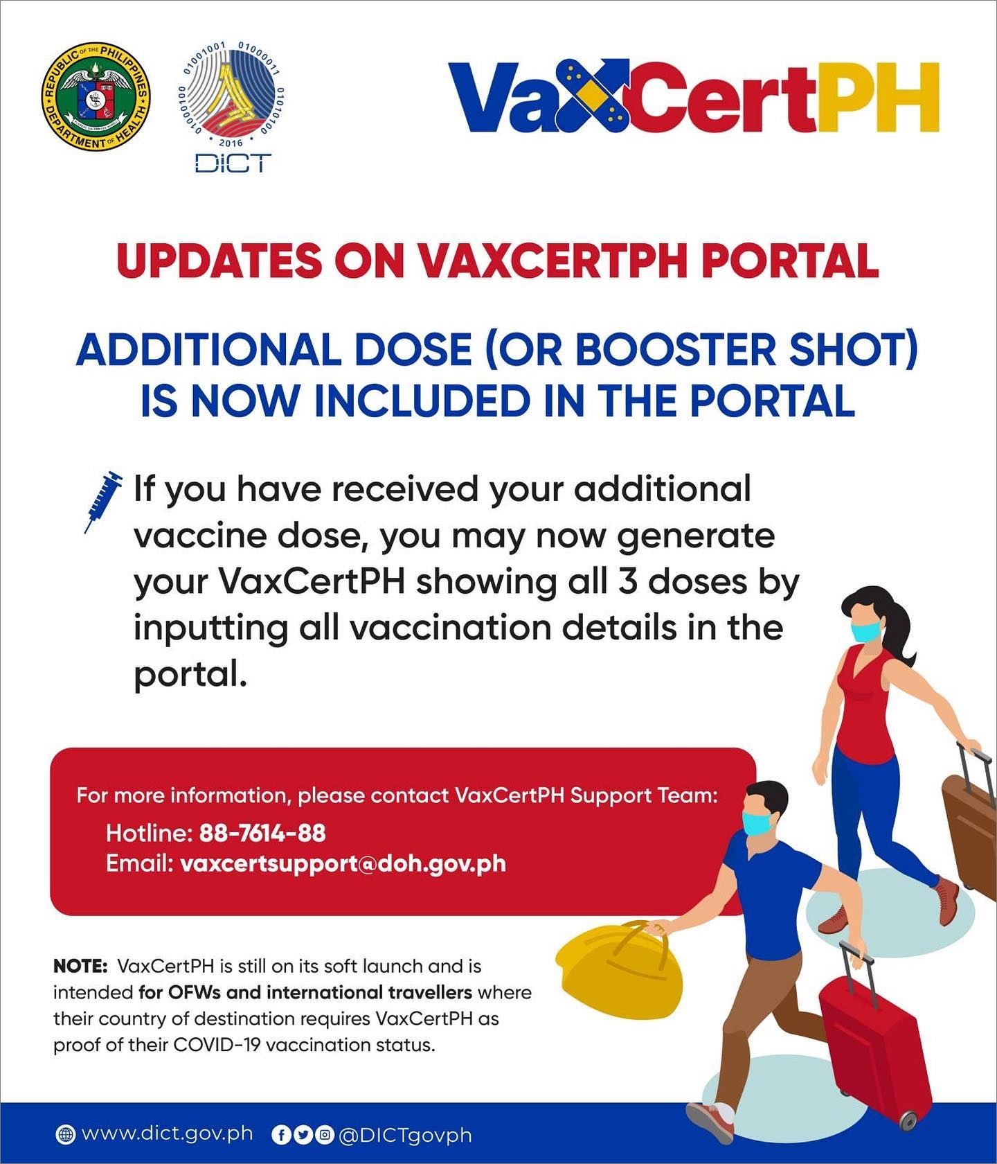 필리핀 정보통신기술부(DICT)의 공지에 따르면 이제 VaxCertPH에 백신 부스터샷(Booster Shot) 접종 이력이 표기된다. 코로나19 백신 부스터샷을 접종했다면 VAXCERTPH 사이트에서 3차접종 이력이 포함된 증명서를 새로 발급받으면 된다.