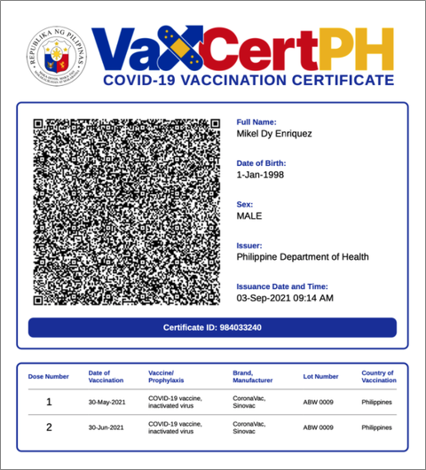 VaxCertPH는 필리핀 정보통신기술부(DICT)에서 지방정부(LGU)에서 발급한 모든 예방접종 카드를 전국적으로 통합하기 위한 목적으로 개발한 디지털 백신접종증명서이다. 해외여행에서도 사용될 수 있도록 세계보건기구(WHO)와 국제항공운송협회(IATA)의 디지털 인증서 표준을 준수하여 개발되었다. 온라인으로 바로 발급 신청이 가능한 데다가 발급비도 무료이지만, 지방정부에서 포털 쪽으로 백신접종에 대한 데이터를 입력해야만 하는 과정이 필요해서 종종 백신접종 이력을 확인할 수 없다는 문구를 보게 된다. 참고로 VaxCertPH에서는 VaxCertPH 자체가 아직 전체 국민을 대상으로 서비스하는 것이 아니며 해외노동자 또는 해외여행자를 발급 대상으로 하고 있다고 밝히고 있다.