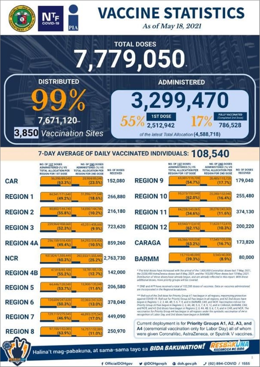 [코로나19 백신] 필리핀 백신 접종 현황(2021년 5월 18일 현재)