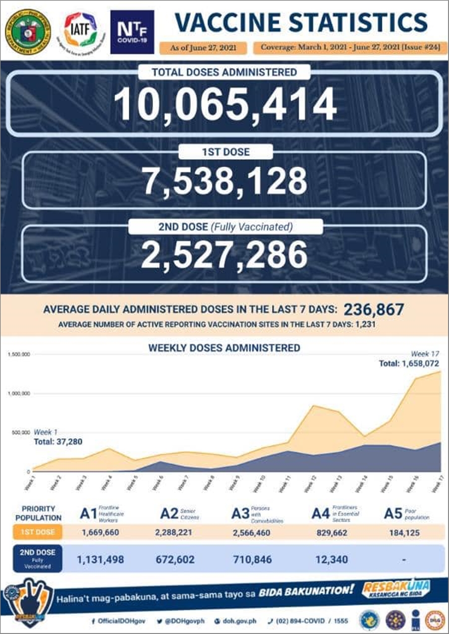 [코로나19 백신] 필리핀 백신 접종 현황(2021년 6월 27일 현재)