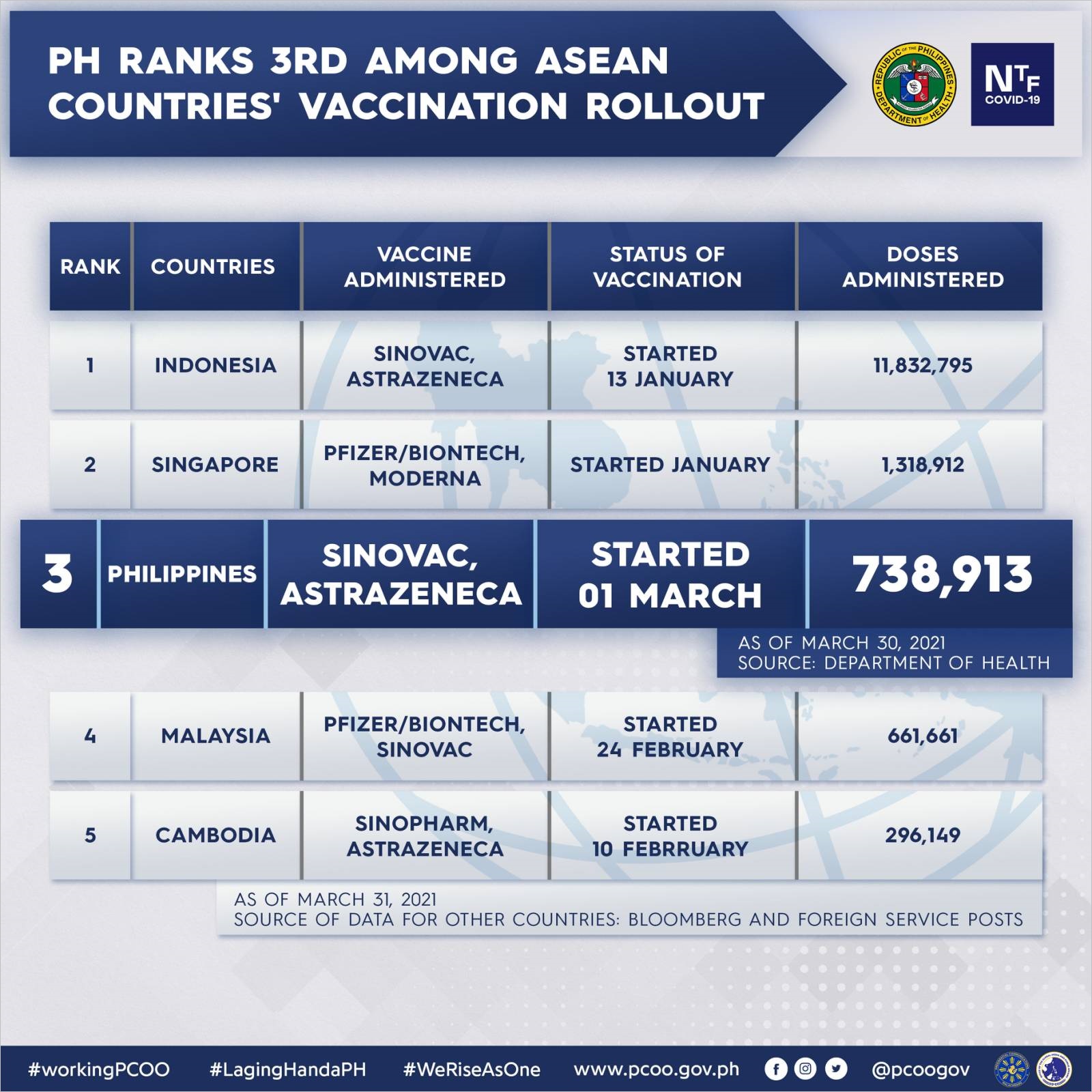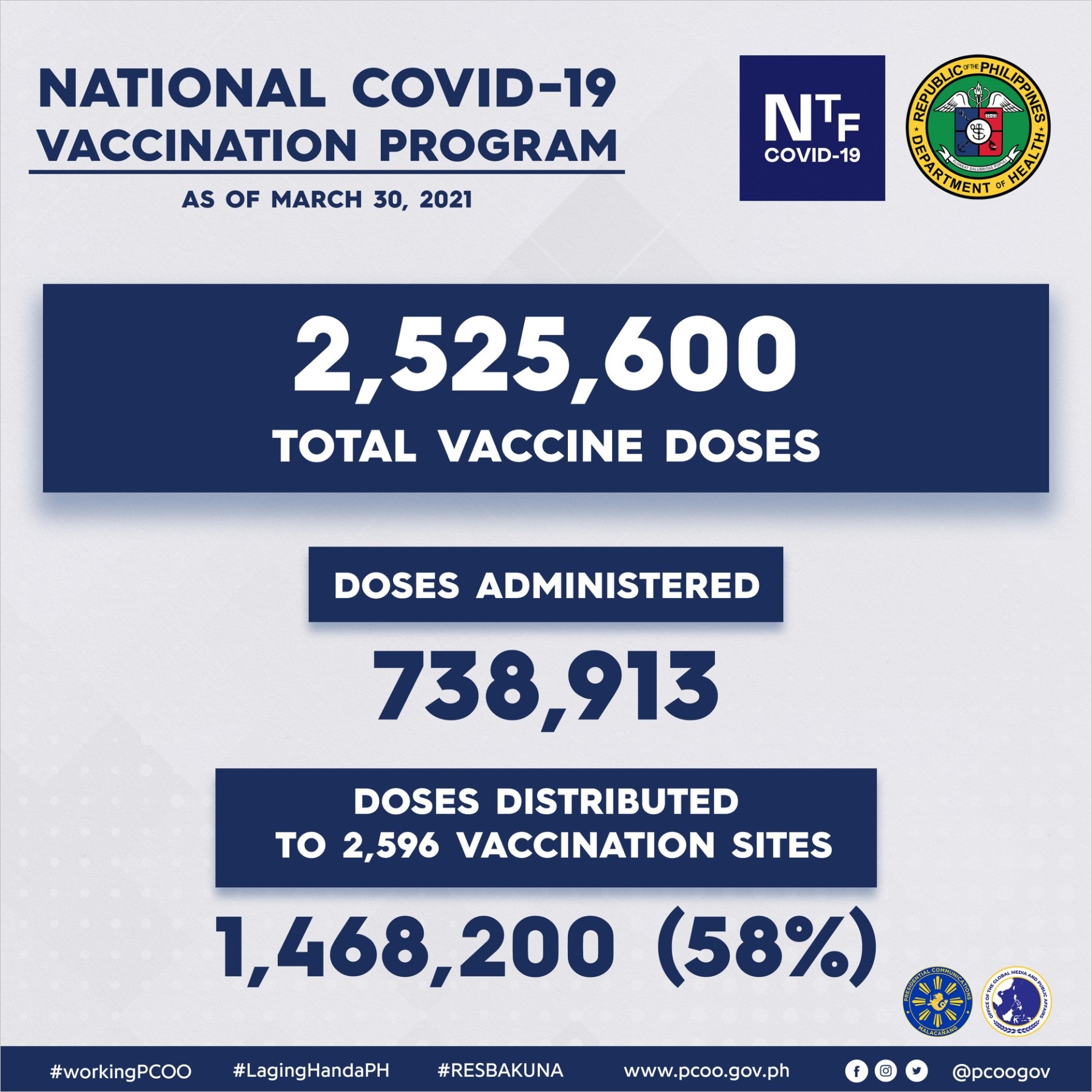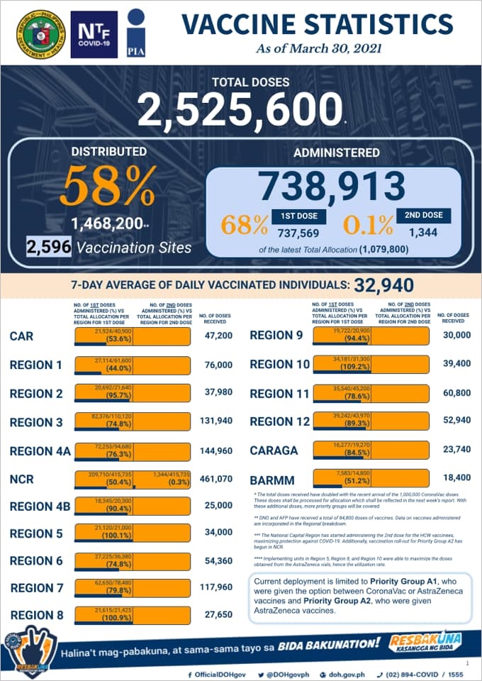 필리핀 보건부에 따르면 전국에 1,759개의 백신 접종소가 운영 중이며, 백신 1,125,600도즈 중 98.21%(1,105,500도즈)가 백신 접종소에 보급되었고, 이 중에서 62.14%(508,332도즈)에 대한 접종이 완료되었음.