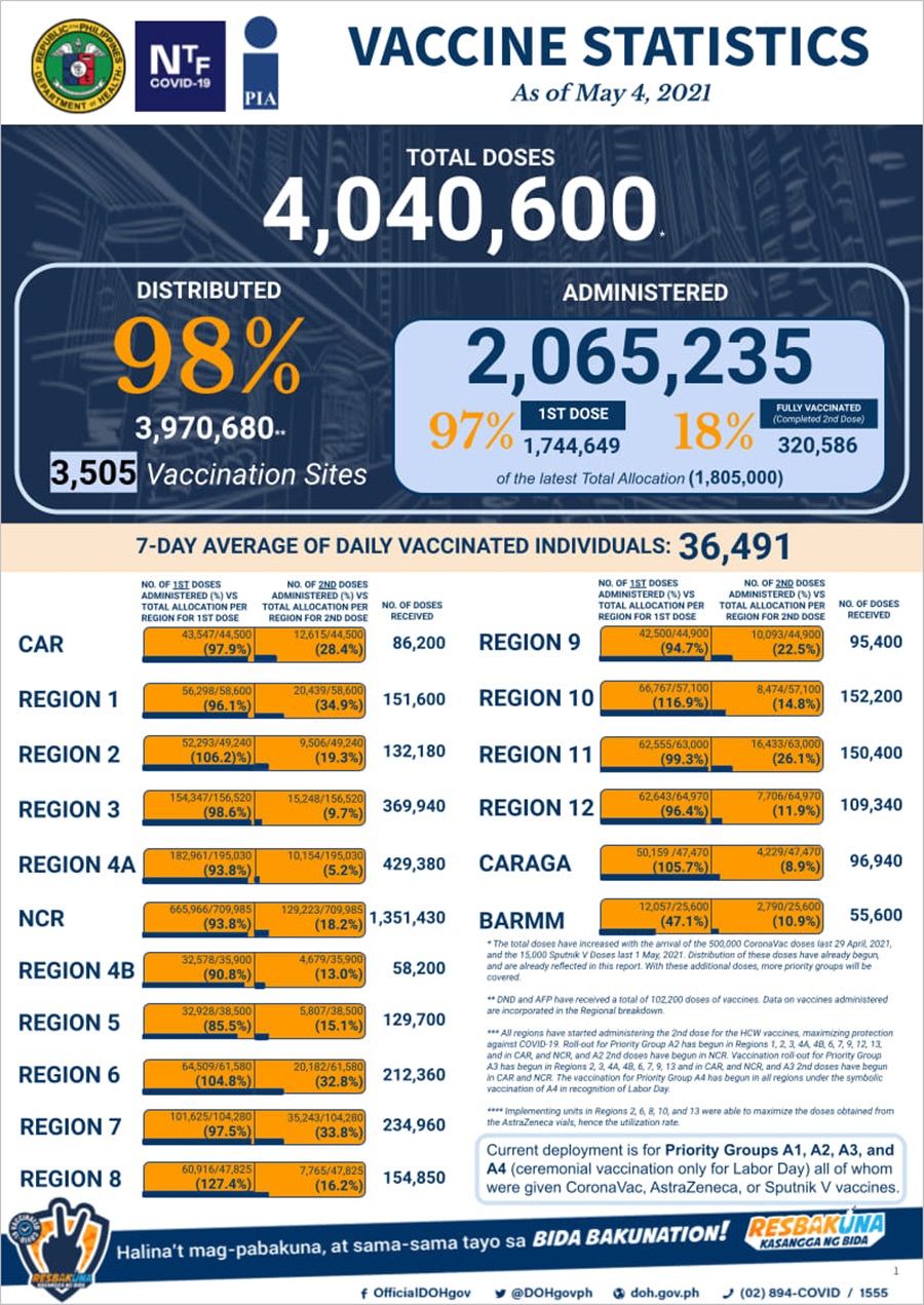 [코로나19 백신] 필리핀의 백신 접종 현황(5월 4일 현재)