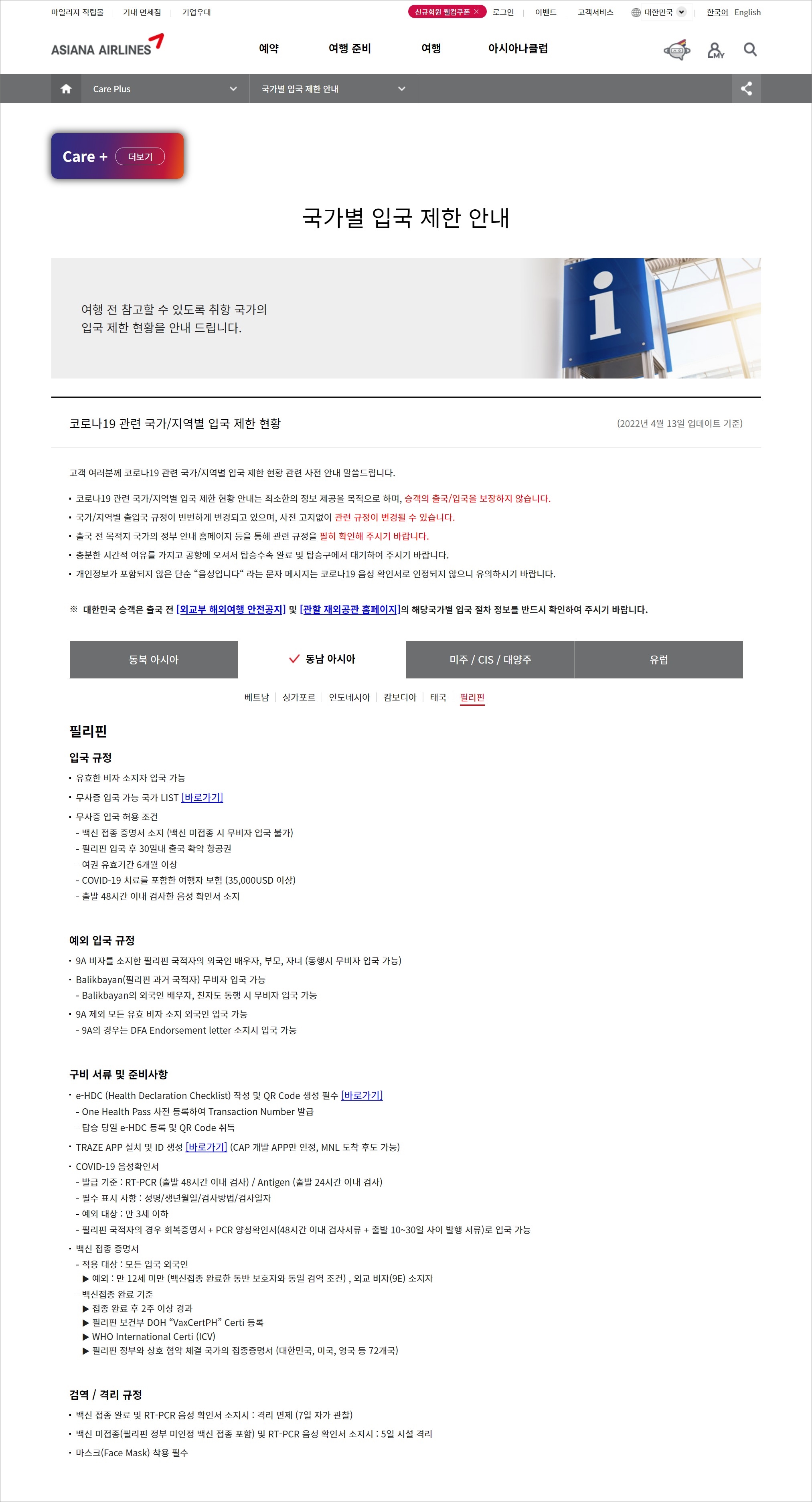 출처 : https://flyasiana.com/C/KR/KO/contents/entry-restrictions