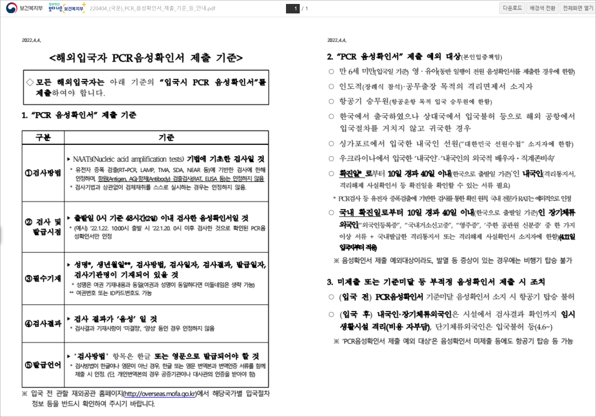 · 질병관리청 : 220404 해외입국자 PCR음성확인서 제출 및 적합기준 안내(단순재검출자 반영)