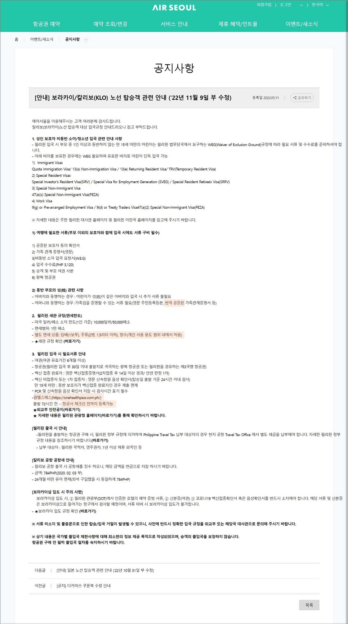 각설하고, 항공사에서 안내하는 필리핀 입국 규정 중 잘못된 부분 몇 가지를 예를 들어보면 아래와 같다. 항공사에서 왜 잘못된 정보를 전달하느냐고 탓하기보다는 필리핀의 경우 워낙 입국 관련 정보가 수시로 바뀌어서 웹사이트 업데이트가 쉽지 않을 것이라고 이해하면 된다. 혹 필리핀 입국 규정을 확인하면서 필리핀 이민국(BI)이나 주한필리핀대사관의 안내문이 영문이라서 읽기가 쉽지 않다면 필리핀 관광부(DOT) 한국사무소의 웹사이트( https://www.itsmorefuninthephilippines.co.kr/travel/entry-guidelines )를 참고하면 된다.