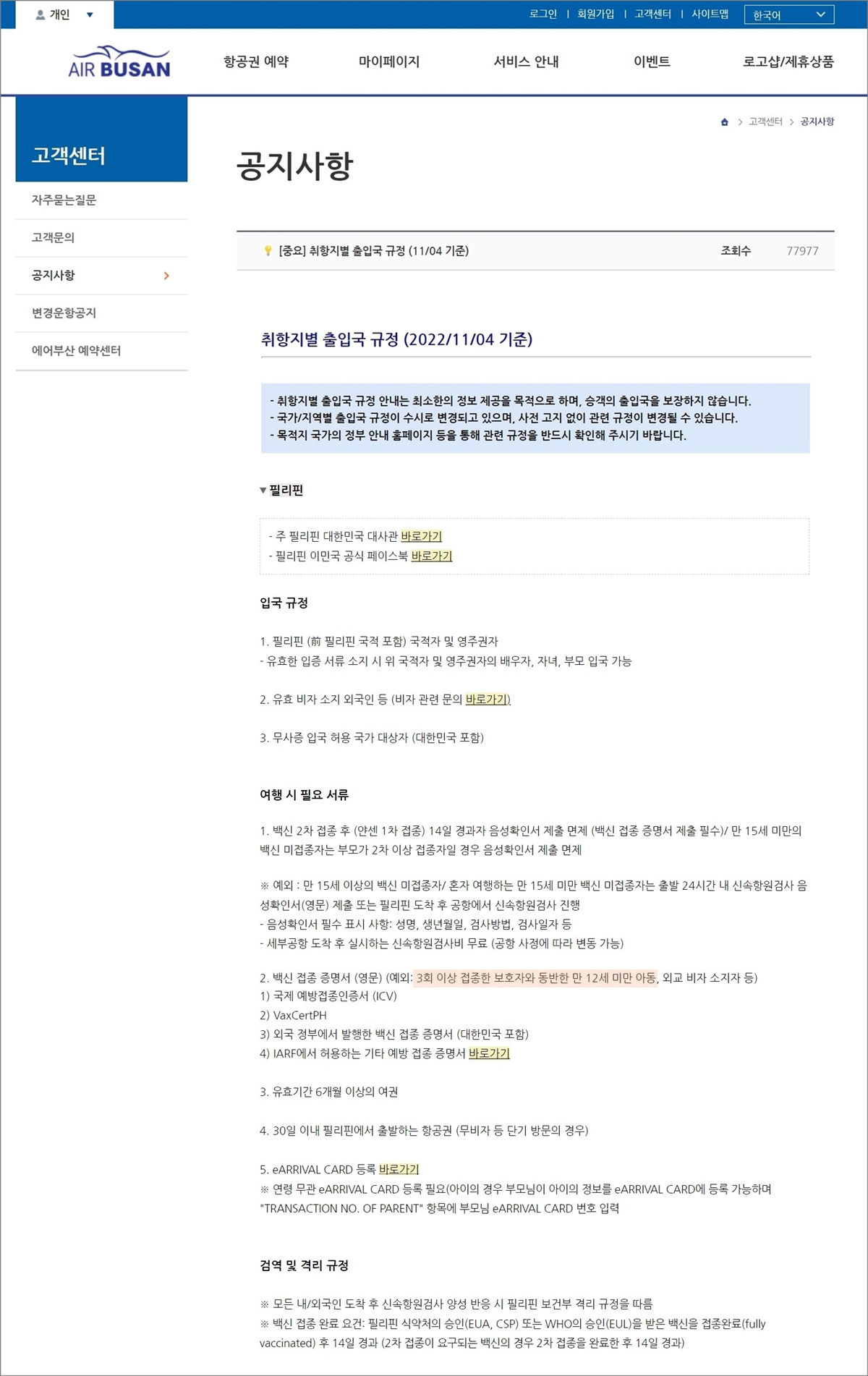 · 에어부산(Air Busan) : 공지사항 [중요] 취항지별 출입국 규정 (11/04 기준)