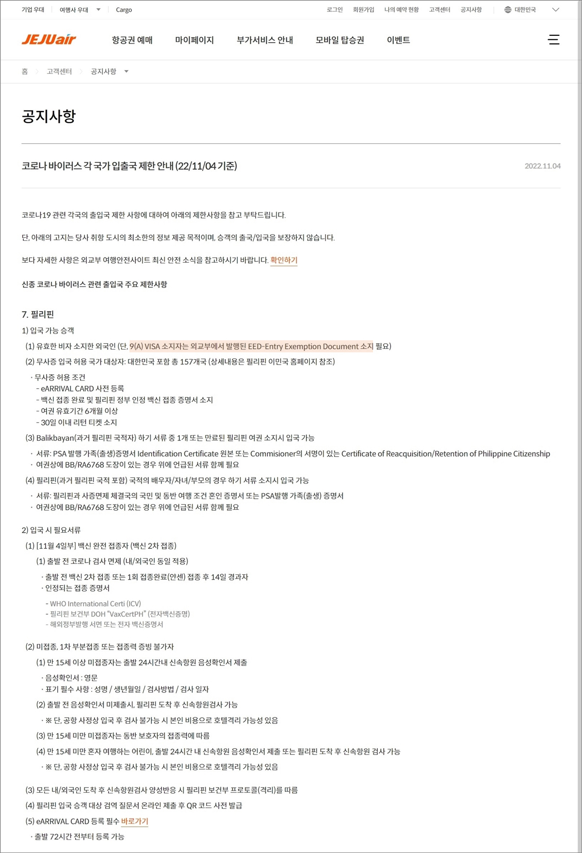 · 제주항공(Jeju Air) : 코로나 바이러스 각 국가 입출국 제한 안내 (22/11/04 기준)