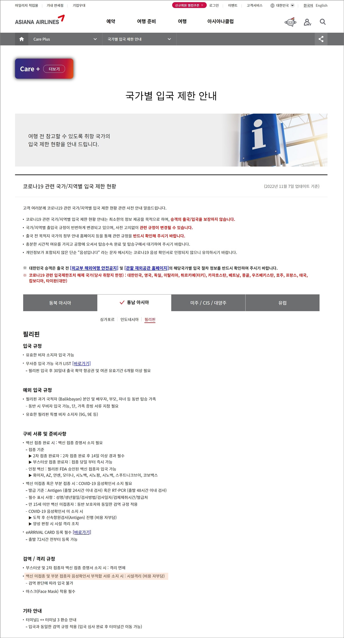 · 아시아나항공(Asiana Airlines) : 국가별 입국 제한 안내