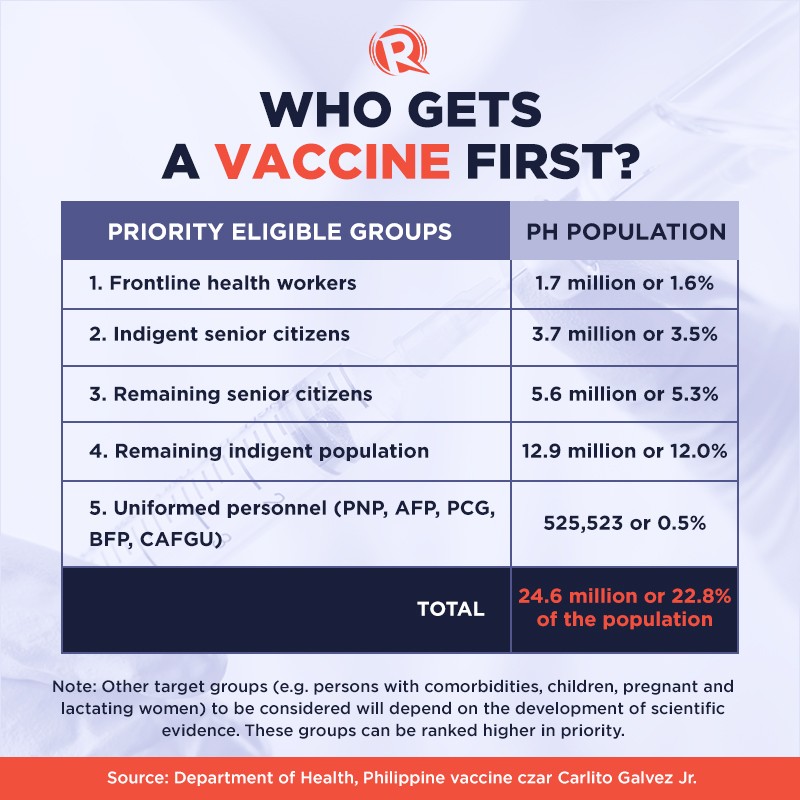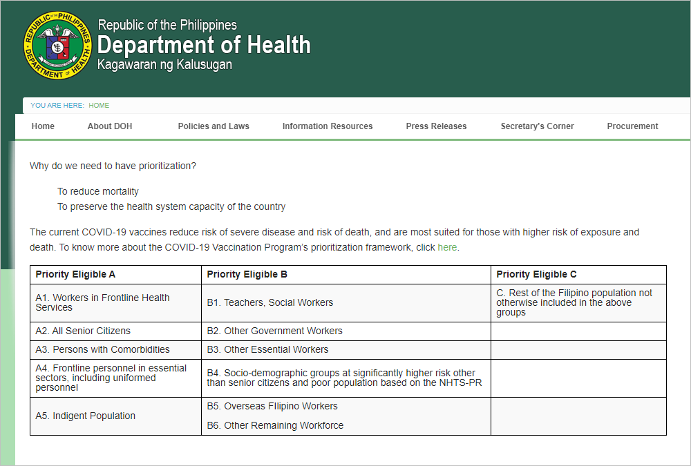 필리핀 정부에서는 코로나19 백신 우선접종 권장 대상자를 A, B, C 세 가지로 분류하고, A그룹부터 순차적으로 백신 접종을 하고 있다. A그룹은 다시 A1, A2, A3, A4, A5로 나뉘는데, 방역을 고려하여 의료기관 종사자를 최우선 순위인 A1그룹에 놓고 있다. 코로나19 환자를 치료하는 의료진, 코로나19 감염률이 높은 고위험 지역에서 환자를 돌보는 의료기관 종사자, 위탁병원의 의료보건 종사자, 응급요원, 의료기관 종사자, 보건의료인이 모두 A1그룹으로 가장 먼저 백신을 맞게 된다.