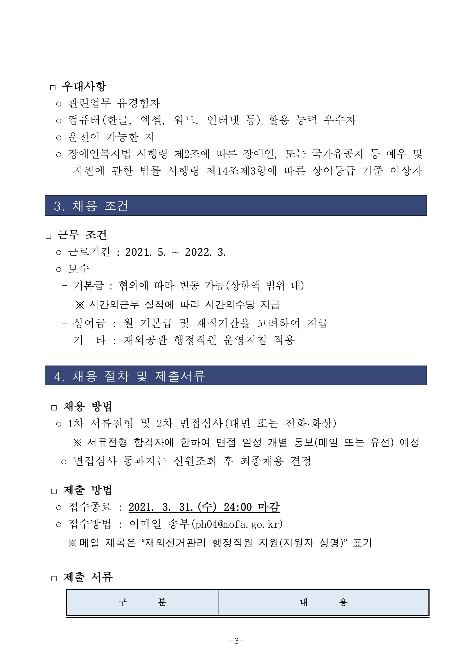 - 메일 제목은 “재외선거관리 행정직원 지원(지원자 성명)” 표기